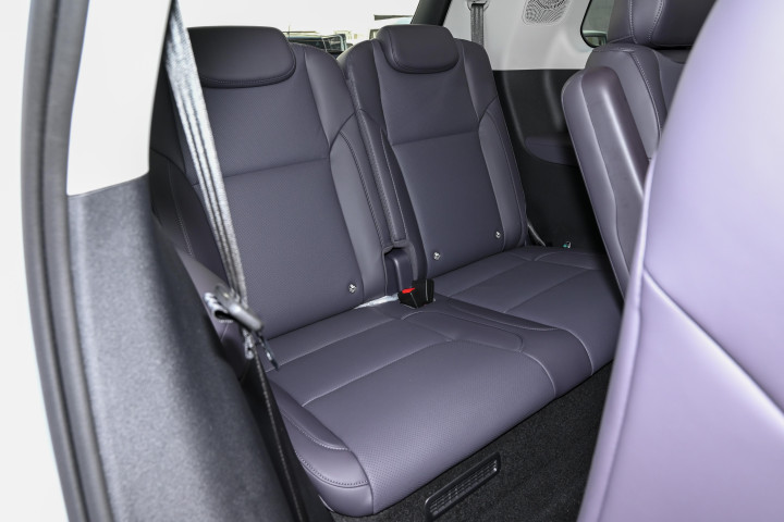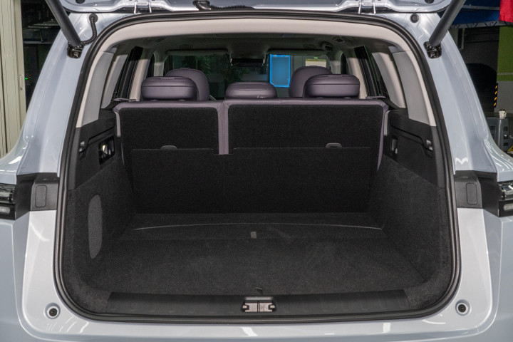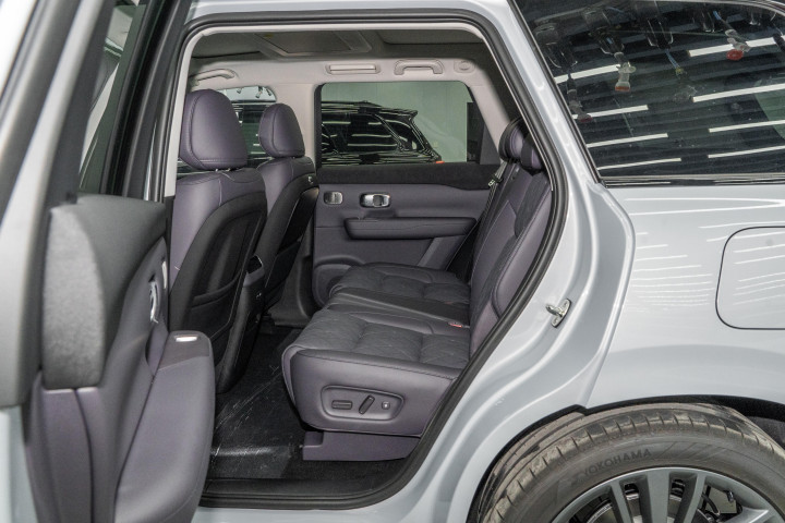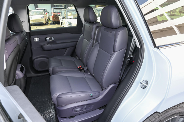 通过后翻电机设计将电机本体后延,放在座位下面,这就使得车内的乘坐空间等效于轴距2950毫米的车型,好处是能增加第三排的腿部和脚部空间。所以6座版本的第三排乘坐空间还是比较宽裕的,可以乘坐成年人,且座椅高度不低,没有做小板凳的憋屈感,二排座椅下方做了掏空处理,坐在第三排脚有地方可以放,舒适性有不小的提升。